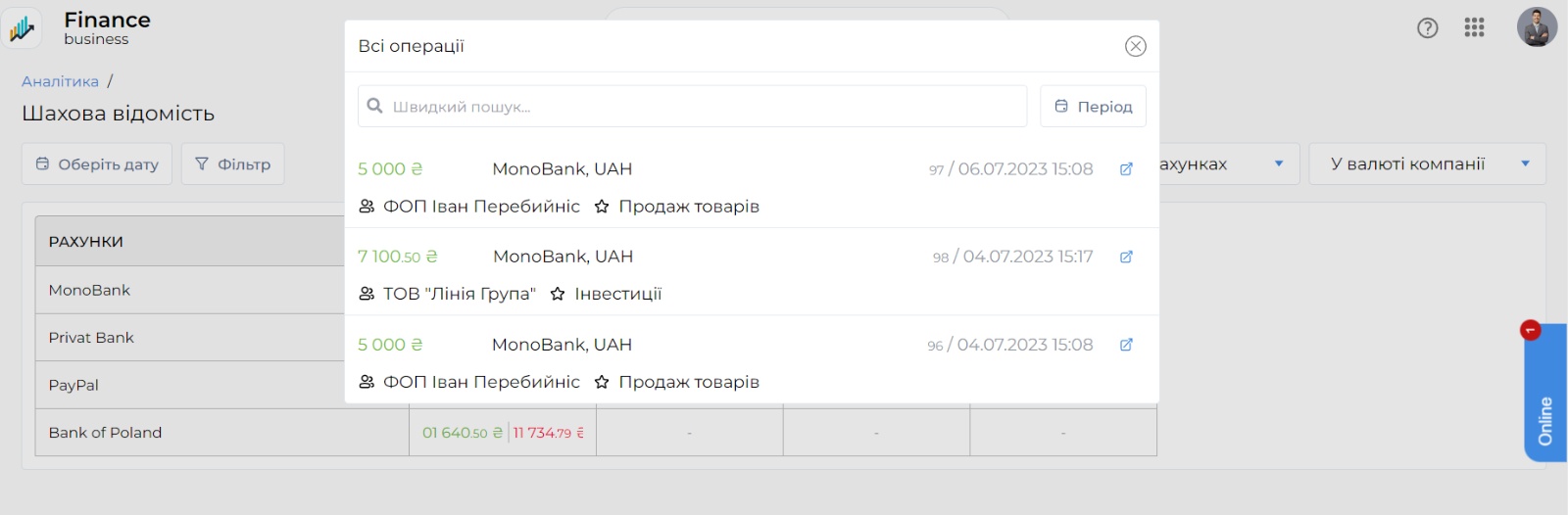 Ми дозволяємо вам одразу в Шаховій відомості подивитися усі фінансові операції. Вам потрібно натиснути на відповідне поле з сумою операцій, і перед вами з'явиться вікно з списком усіх фінансових операцій. Ви можете детально подивитися, які фактичні фінансові потоки вплинули на поточні дані, відображені у таблиці. За бажанням ви можете перейти на карточку фінансової операції або знайти потрібну операцію в списку за допомогою пошуку.