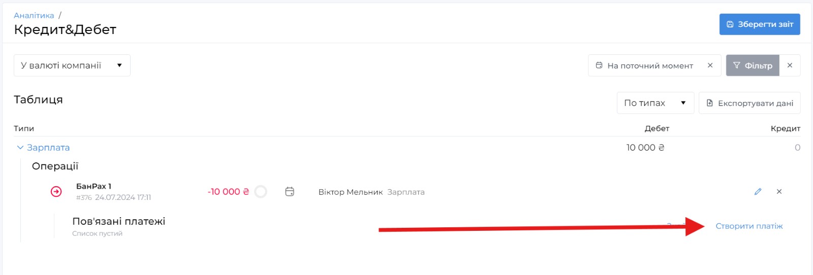 У цьому ж звіті Ви можете створити платіж виплати зарплати співробітнику. Таким чином Ви можете одночасно бачити повну картину по вашим співробітникам, скільки потрібно виплатити і скільки фактично виплачено. І робити це можна з самого звіту.