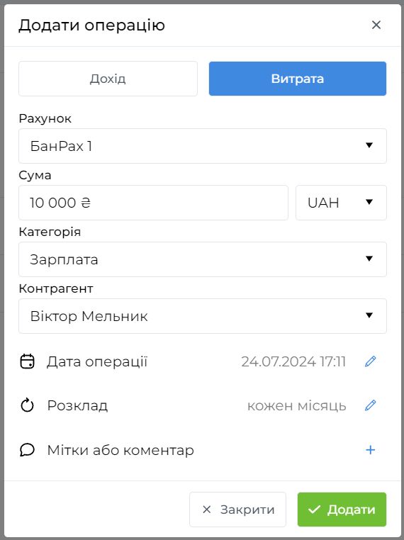 2. Створіть операцію з категорією "Зарплата". В операції Ви маєте обрати контрагента, яку виплачується зарплата, і вказати дату виплати зарплати. Також ви можете вказати розклад, наприклад, щомісяця.