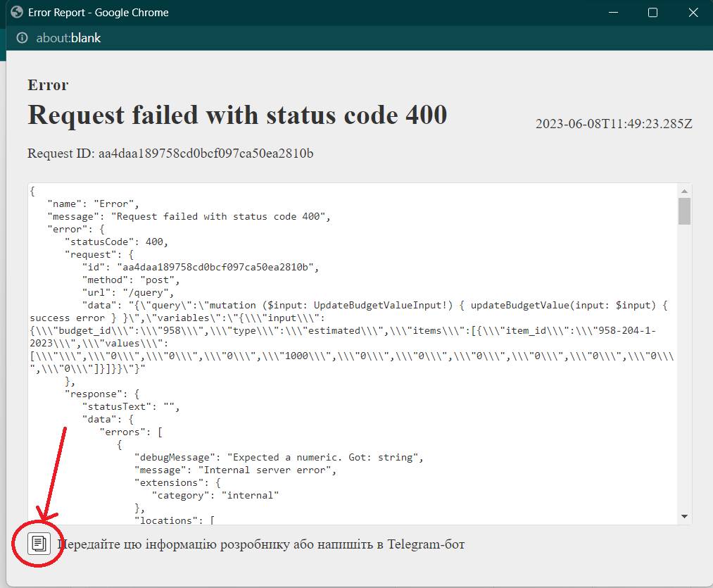 Тоді з'являється вікно (див. фото) з текстом помилки у вигляді програмного коду. Користувач може натиснути внизу на кнопу "Копіювати". Текст помилки буде скопійований. Користувач може надіслати цей текст в службу Підтримки через Telegram-bot.