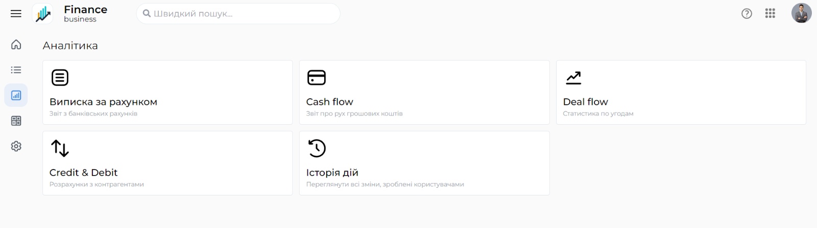 У додатку OneB Finance доступні чотири види аналітики, які допомагають користувачам зрозуміти фінансовий стан їх бізнесу та проводити детальний аналіз фіноперацій. Кожен вид аналітики має свої особливості і надає корисну інформацію для прийняття управлінських рішень.