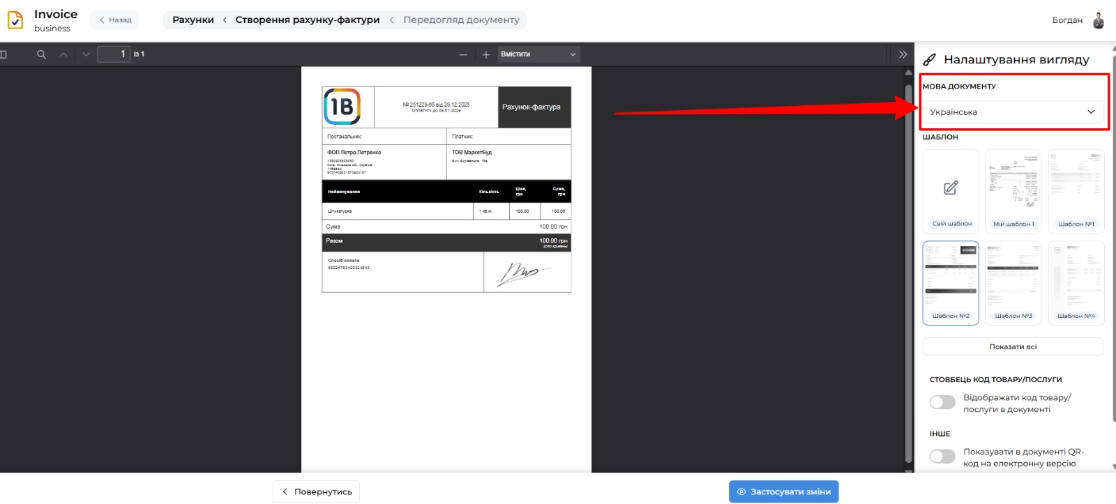 На етапі створення, виберіть потрібну мову для шаблону документу. Обрана мова автоматично перекладе лише назви полів, зберігаючи ваші дані незмінними.