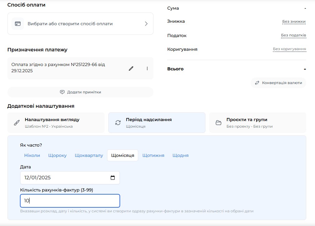 За допомогою Розкладу ви можете за раз створити потрібну кількість рахунків-фактур з конкретним розкладом. Тобто, якщо ви виставляєте щомісяця в один день рахунок-фактуру, то можете обрати "Щомісяця" і число (наприклад, 07). Обравши кількість рахунків-фактур, ви обрали на скільки місяців ВПЕРЕД ви створите рахунків-фактур.